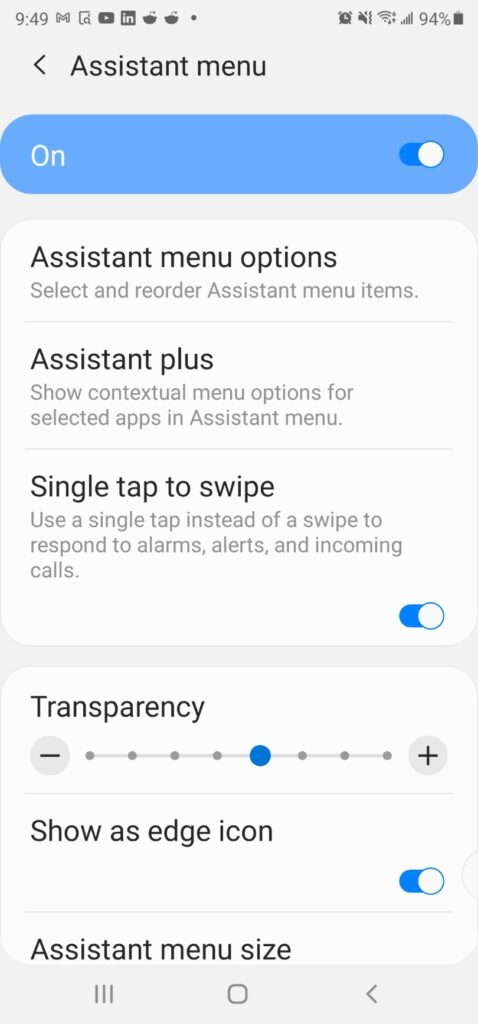 To get the floating menu out of your way, you can no longer drop it onto a big red X on the home screen and make it disappear. You must turn it on and leave it lurking there. But you can make it unobtrusive and harder to open accidentally. Toggle on Show as edge icon and that will move it off to the curved side of the screen. You can reposition it by dragging it right or left and up and down. I now have it on the upper right corner – a portion of the screen I rarely have to touch, so it doesn’t pop open while I’m trying to do other things. You could make it invisible, but then you couldn’t see where it’s lurking, and that’s kind of creepy.