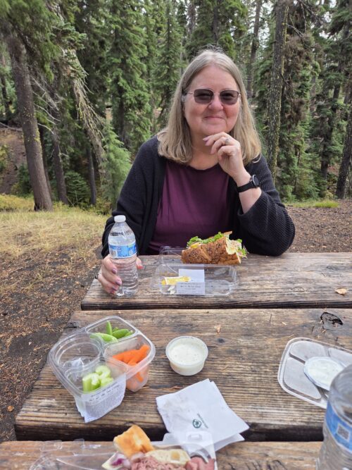 When we got to Portland, it was afternoon and we had a long drive to make it to Crater Lake before dark. We made it, but it was cold, rainy, and foggy. We only got the tiniest hint of the breathtaking beauty that was to come. The next day was partly cloudy, with stunning moments of sunshine that let us see the whole of Crater Lake. We found a little secluded picnic area and enjoyed the sandwiches we’d bought that morning. Until a pesky bee started bothering us. I shooed it off. It returned, moments later, with a friend. The friend brought more friends. We took that as a sign that it was time to move on.