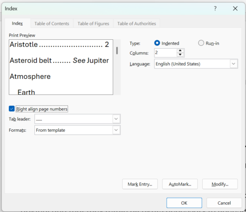 MS Word Index Entry Dialog
